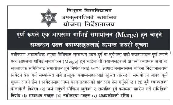 काठमाडौं : त्रिभुवन विश्वविद्यालयले आफ्ना सम्वन्धन प्राप्त कलेजहरुलाई एकापसमा गाभिन चाहने भए असार मसान्तसम्म निवेदन दिन आह्वान गरेको छ । तविश्वविद्यालयले सूचना निकालेर त्रिविबाट सम्बन्धन प्राप्त गरेका दुई वा दुईभन्दा बढी क्याम्पसहरु मर्ज हुन चाहेमा योजना निर्देशनालयमा निवेदन दिन सक्ने जनाएको छ ।मर्ज हुन चाहने क्याम्पसहरुले आफ्नो क्याम्पस सभा वा सञ्चालक समितिबाट समायोजन हुने निर्णय गराएर निर्देशनालयमा निवेदन दिन सक्नेछन् ।निवेदनको साथमा मर्ज हुन इच्छुक क्याम्पसको बेग्लाबेग्लै निवेदन, मर्ज गर्नुपर्ने औचित्य खुलेको र समाहित हुने क्याम्पस खारेज गर्ने समितिको निर्णय, सम्बन्धन पत्रहरु, नवीकरण पत्रहरु र अक्षयकोषको रसिदसमेत पेस गर्न त्रिविले भनेको छ ।त्रिविका कतिपय सम्बन्धन प्राप्त र आंगिक क्याम्पसहरु न्युन विद्यार्थी र सन्चालन खर्चको अभावमा संकटमा छन् ।विश्वविद्यालय अनुदान आयोगका अनुसार देशभर १ हजार ४४० आंगिक, सामुदायिक र निजी क्याम्पसहरुमध्ये ३ सय निजी, २१८ सामुदायिक र २१ क्याम्पसमा १०० भन्दा कम विद्यार्थीहरु छन् । कतिपयले अध्यापक र कर्मचारीहरुलाई तलबसमेत खुवाउन नसकेका समाचार सार्वजनिक भएपछि त्रिविले यो अभियान थालेको हो ।