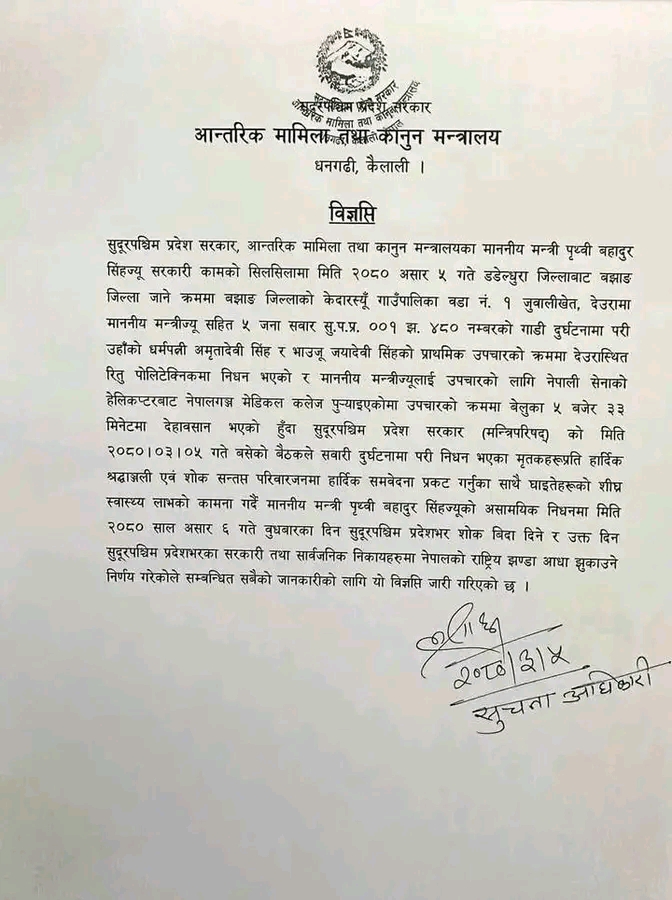 धनगढी — सुदूरपश्चिम प्रदेश सरकारले बुधबार प्रदेशभर शोक बिदा दिने निर्णय गरेको छ । मंगलबार सवारी दुर्घटनामा निधन भएका आन्तरिक मामिला तथा कानुनमन्त्री पृथ्वीबहादुर सिंहको शोकमा सार्वजनिक बिदा दिने निर्णय गरिएको हो ।