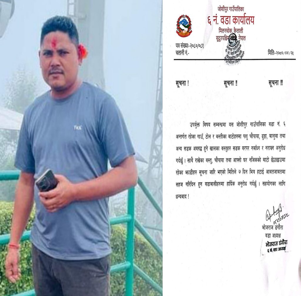 जिल्ला को जोशिपुर गाउँपालिका वडा नम्बर ६ का वडा अध्यक्ष भोजराज डगौरा ले वडा अन्तर्गत रहेका गाउँ टोल र बस्तिका बाटोहरुमा पशु चौपाया ढुङ्गा बालुवा तथा अन्य सडक अबरुद्द हुने खालका बस्तुहरु सडक वरपर नबाँध्न र नराख्न हुन भनी २०८०/४/२५ गते पत्राचार गरेका छन्