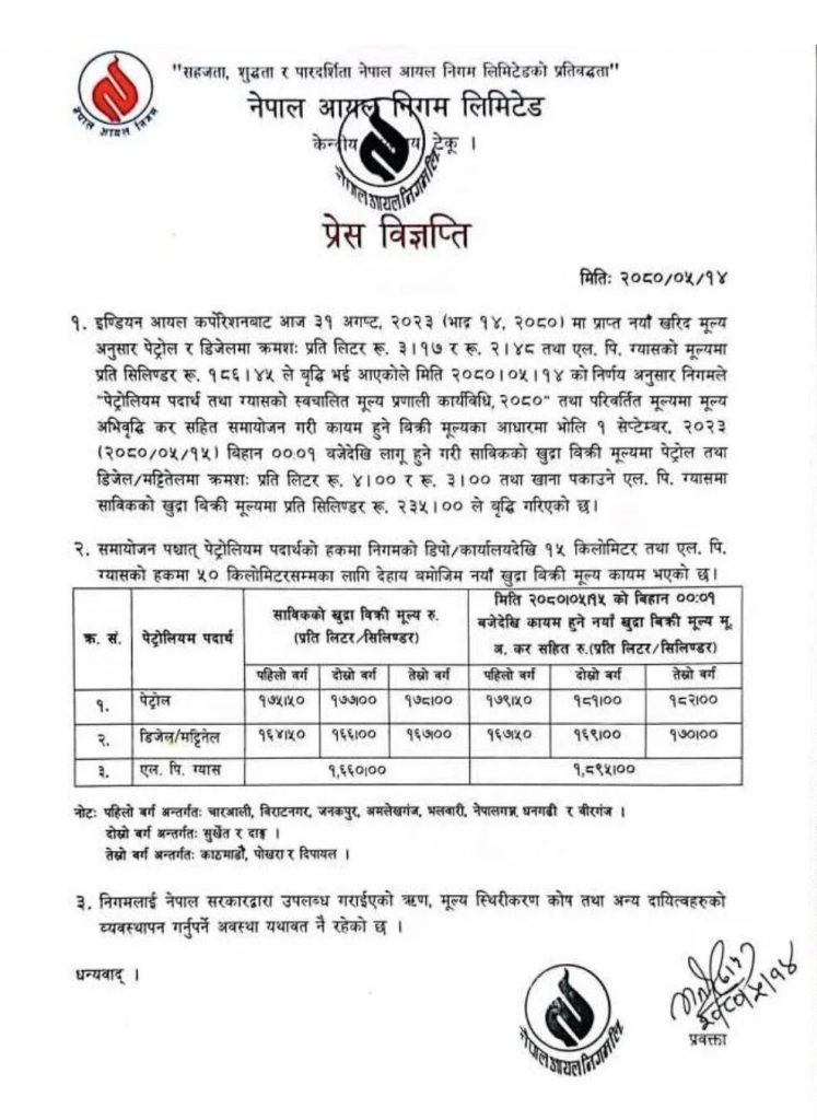 पेट्रोलमा प्रतिलिटर ४ रुपैयाँ, डिजेल र मट्टितेलमा प्रतिलिटर ३ रुपैयाँ र एलपी ग्यासमा प्रतिसिलिन्डर २३५ रुपैयाँ बढेको निगमले जनाएको छ। निगमले मूल्य वृद्धि आज राति १२ बजेदेखि लागू भएको जनाएको छ। इण्डियन आयल कर्पोरेशनबाट बिहीबार मूल्य वृद्धि भएर आएको निगमले जनाएको छ।