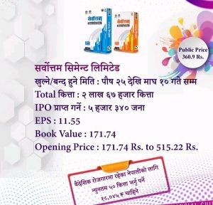 सर्वोत्तम सिमेन्टले आइपीओ भोलिदेखि निष्काशन गर्ने भएको छ। कम्पनीले भोलिदेखिउद्योग प्रभावित क्षेत्रका स्थानीय बासिन्दा तथा वैदेशिक रोजगारीमा रहेका नेपालीका लागि आइपीओ बिक्री खुला गर्न लागेको हो ।