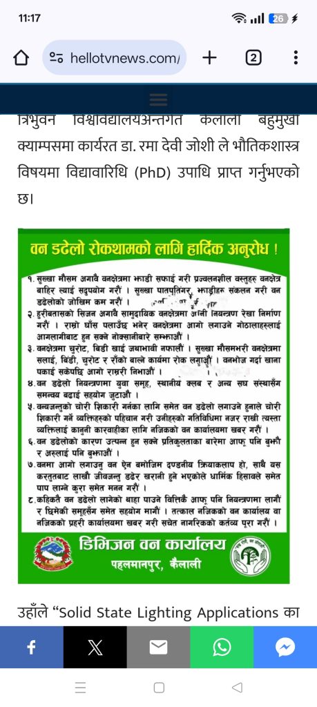 सुदूरपश्चिमको विज्ञान क्षेत्रमा ऐतिहासिक उपलब्धि त्रिभुवन विश्वविद्यालयअन्तर्गत कैलाली बहुमुखी क्याम्पसमा कार्यरत डा. रमा देवी जोशी ले भौतिकशास्त्र विषयमा विद्यावारिधि (PhD) उपाधि प्राप्त गर्नुभएको छ।