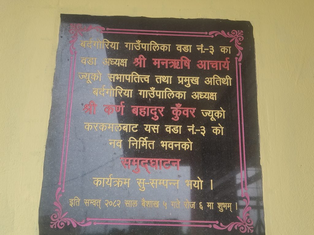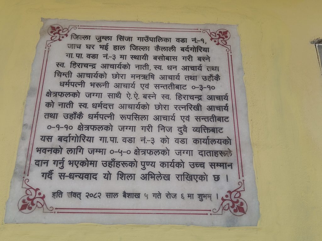 कैलालीको बर्दगोरिया गाउँपालिका वडा नम्बर ३ का वडा अध्यक्ष मनऋषि आचार्य र उनका दाजु रत्नऋषि आचार्यले वडा नम्बर ३ को वडा कार्यलय निर्माण गर्नको लागि ५ कठ्ठा जमिन प्रशासकीय भवन र ३ कठ्ठा जमिन वडा कार्यलय जाने बाटोको लागि गरि जम्मा ८ कठ्ठा जमिन दान गरेका हुन
